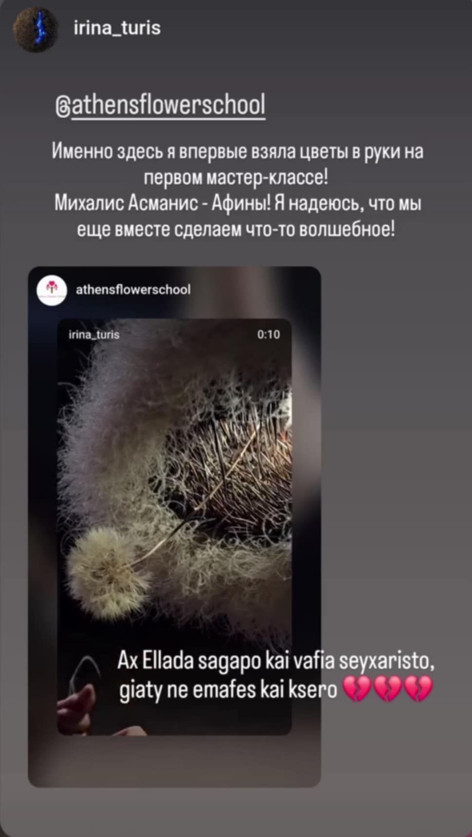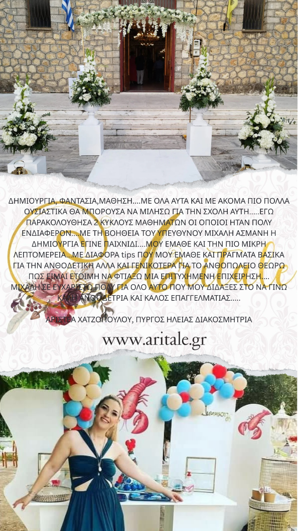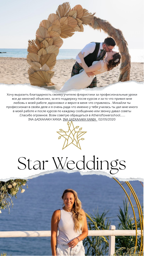 Хочу выразить благодарность своему учителю флористики за профисиональные уроки все до мелочей объяснял, за его поддержку после курсов и за то что привил мне любовь к моей работе ,вдохновил и верил в меня что справлюсь . Михайли ты профессионал в своём деле и я очень рада что именно у тебя училась ты дал мне много в моей работе и после курсов по каждому сообщению или звонку давал советы .Спасибо огромное. Всем советую обращаться в Athensflowersshool...... ΙΝΑ ΔΑΣΚΑΛΑΚΗ ΧΑΝΙΑ https://www.starweddings.gr/en/ 02/05/2020