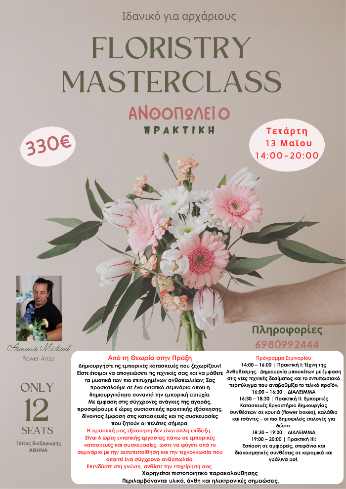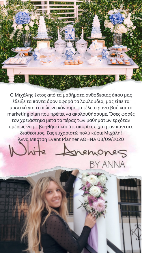 Ο Μιχάλης έκτος από τα μαθήματα ανθοδεσιας όπου μας έδειξε τα πάντα όσον αφορά τα λουλούδια, μας είπε τα μυστικά για το πώς να κάνουμε το τέλειο ραντεβού και το marketing plan που πρέπει να ακολουθήσουμε. Όσες φορές τον χρειάστηκα μετα το πέρας των μαθημάτων ερχόταν αμέσως να με βοηθήσει και ότι απορίες είχα ήταν πάντοτε διαθέσιμος. Σας ευχαριστώ πολύ κύριε Μιχάλη! Άννα Μπότση Event Planner ΑΘΗΝΑ 08/09/2020