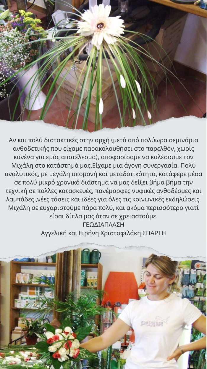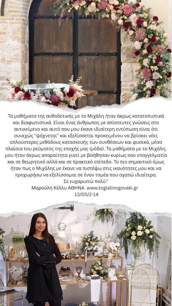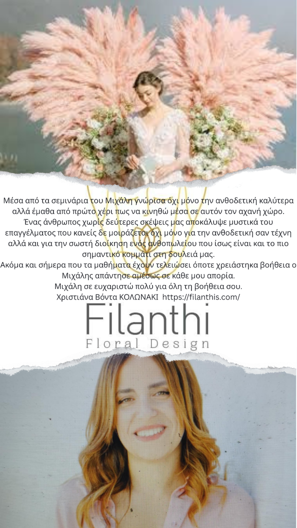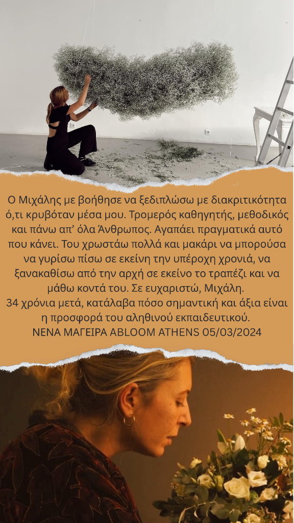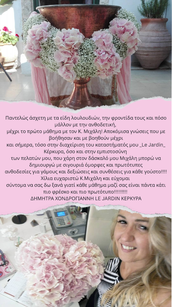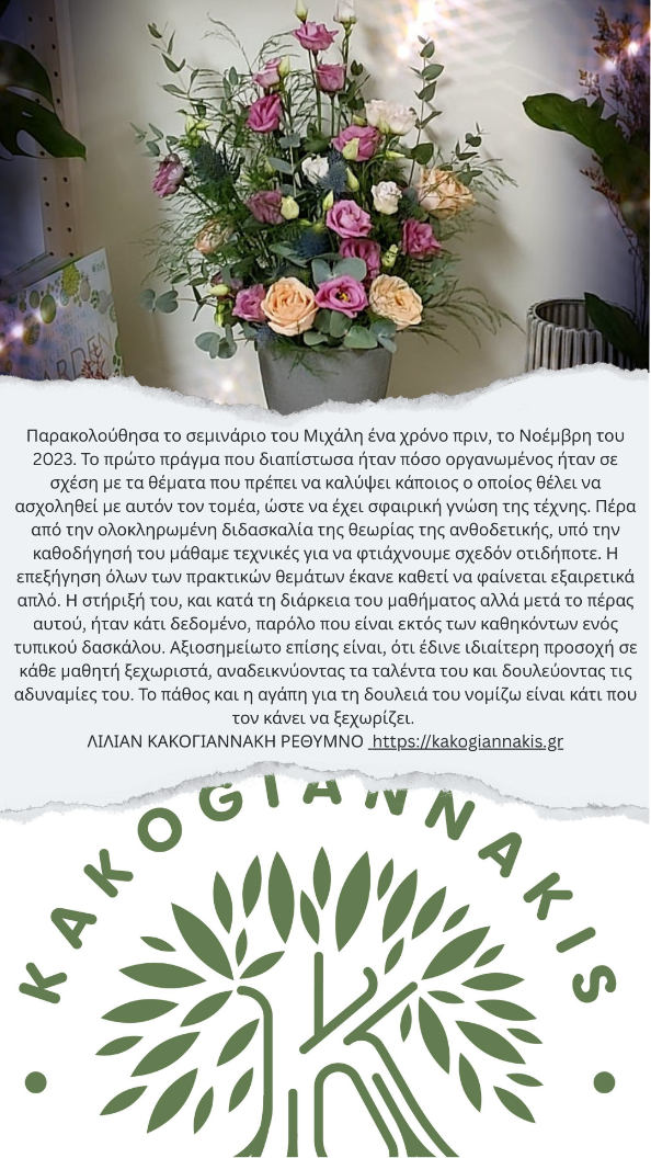 Mε το Μιχάλη είχα τη χαρά να παρακολουθήσω και τους 2 κύκλους μαθημάτων. Ηταν μία πολύ ιδιάιτερη εμπειρία για μένα, πολυ δημιουργική και ενδιαφέρουσα. Η εμπειρία του, η καθοδήγηση, οι ιδέες και η αγάπη του για τα λουλούδια μου άνοιξαν νέους ορίζοντες σε αυτό τον επαγγελματικό τομέα.