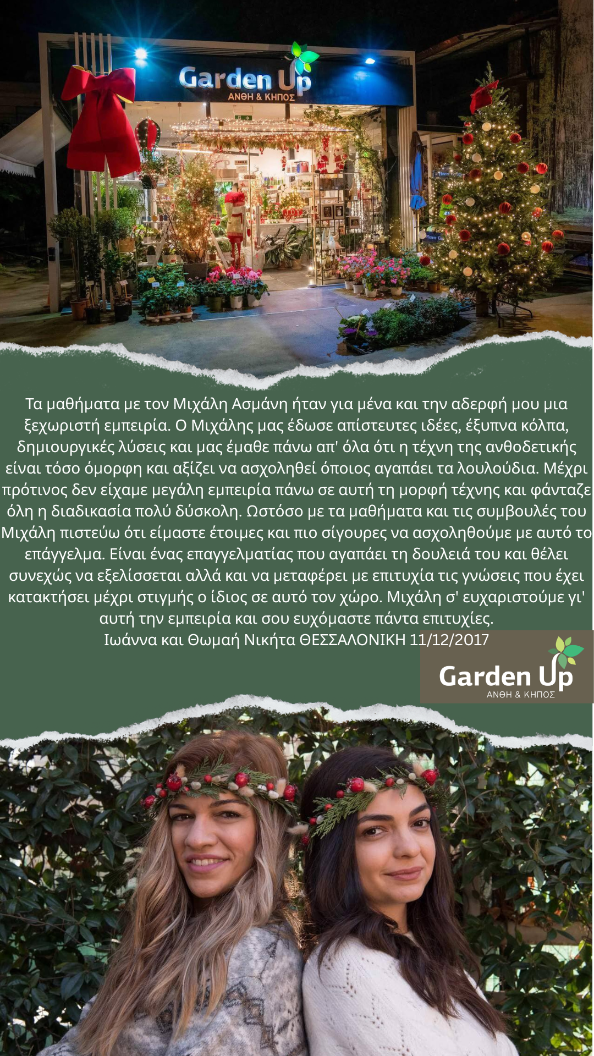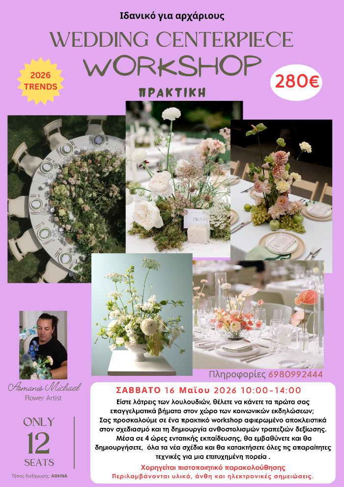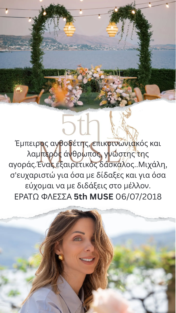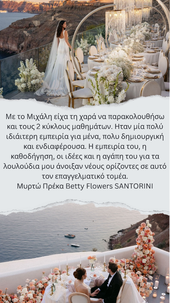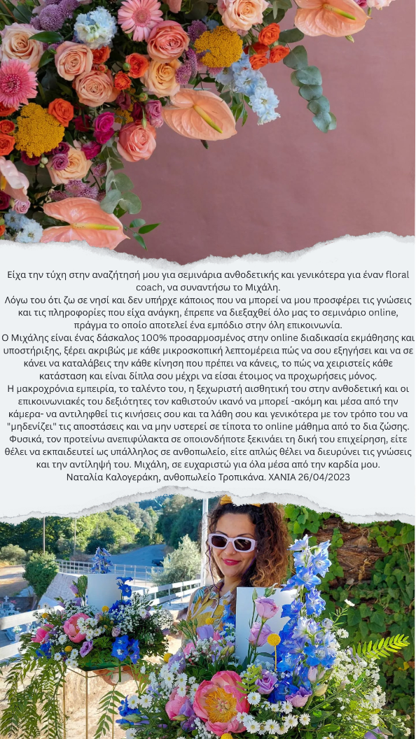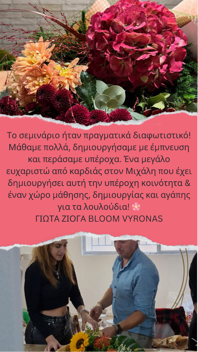 Mε το Μιχάλη είχα τη χαρά να παρακολουθήσω και τους 2 κύκλους μαθημάτων. Ηταν μία πολύ ιδιάιτερη εμπειρία για μένα, πολυ δημιουργική και ενδιαφέρουσα. Η εμπειρία του, η καθοδήγηση, οι ιδέες και η αγάπη του για τα λουλούδια μου άνοιξαν νέους ορίζοντες σε αυτό τον επαγγελματικό τομέα.
