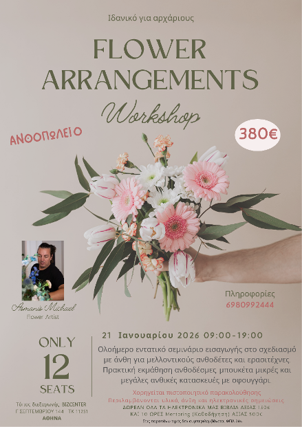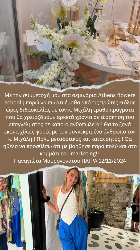 Με την συμμετοχή μου στα σεμινάρια Athens flowers school μπορώ να πω ότι έμαθα από τις πρώτες κιόλας ώρες διδασκαλίας με τον κ. Μιχάλη έμαθα πράγματα που θα χρειαζόμουν αρκετά χρόνια σε εξάσκηση του επαγγέλματος σε κάποιο ανθοπωλείο!! Θα το ξανά εκανα χίλιες φορές με τον συγκεκριμένο άνθρωπο τον κ. Μιχάλη!! Πολύ μεταδοτικός και κατανοητός!! Θα ήθελα να προσθέσω ότι με βοήθησε παρά πολύ και στο κομμάτι του marketing!! Παναγιώτα Μαυρογονάτου ΠΑΤΡΑ 12/11/2024