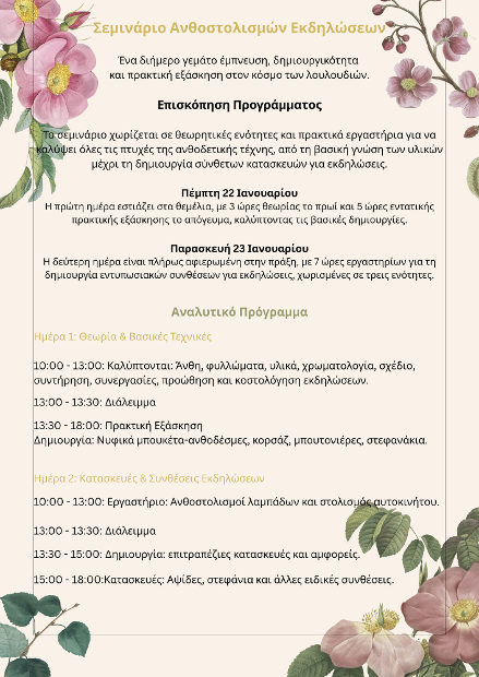Επιμορφωτικά σεμινάρια ανθοδετικής και όλα τα απαραίτητα για την επαγγελματική αποκατάσταση των αποφοίτων μας, είτε ως εργαζόμενοι είτε για να δημιουργήσουν την δική τους επιχείρηση.