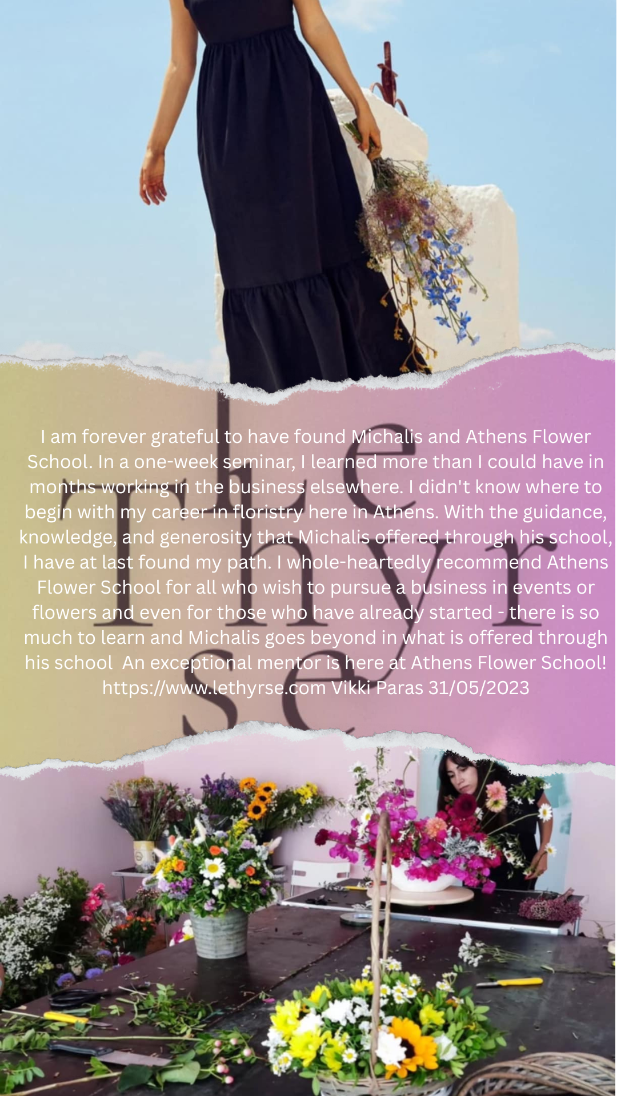 I am forever grateful to have found Michalis and Athens Flower School. In a one-week seminar, I learned more than I could have in months working in the business elsewhere. I didn't know where to begin with my career in floristry here in Athens. With the guidance, knowledge, and generosity that Michalis offered through his school, I have at last found my path. I whole-heartedly recommend Athens Flower School for all who wish to pursue a business in events or flowers and even for those who have already started - there is so much to learn and Michalis goes beyond in what is offered through his school