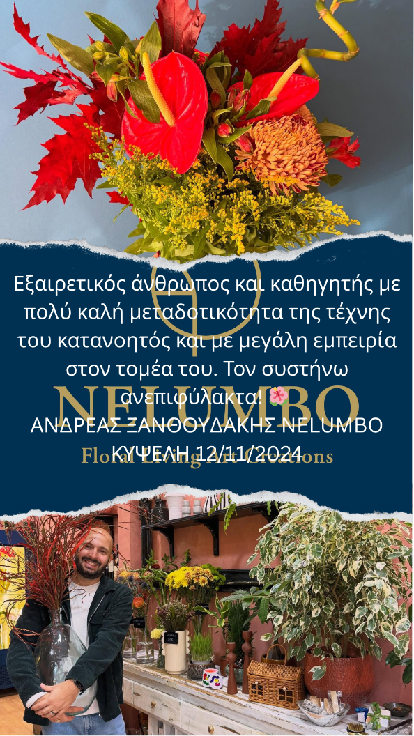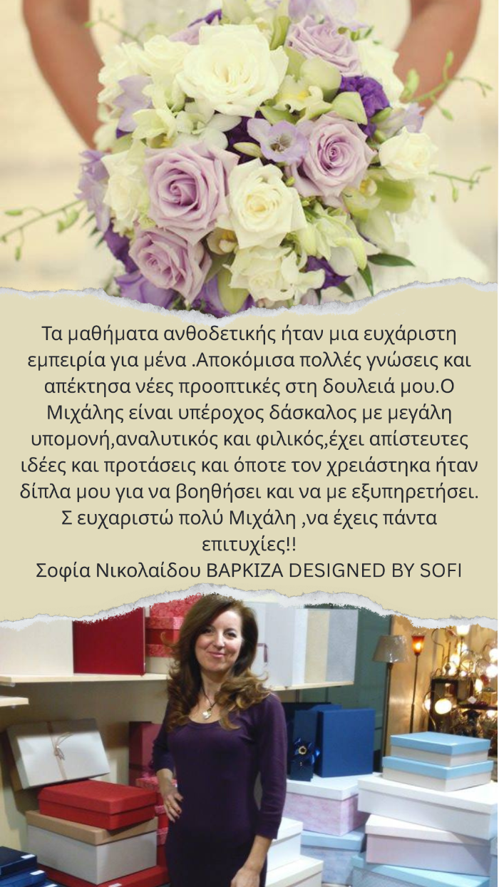 Τα μαθήματα ανθοδετικής ήταν μια ευχάριστη εμπειρία για μένα .Αποκόμισα πολλές γνώσεις και απέκτησα νέες προοπτικές στη δουλειά μου.Ο Μιχάλης είναι υπέροχος δάσκαλος με μεγάλη υπομονή,αναλυτικός και φιλικός,έχει απίστευτες ιδέες και προτάσεις και όποτε τον χρειάστηκα ήταν δίπλα μου για να βοηθήσει και να με εξυπηρετήσει. Σ ευχαριστώ πολύ Μιχάλη ,να έχεις πάντα επιτυχίες!!
