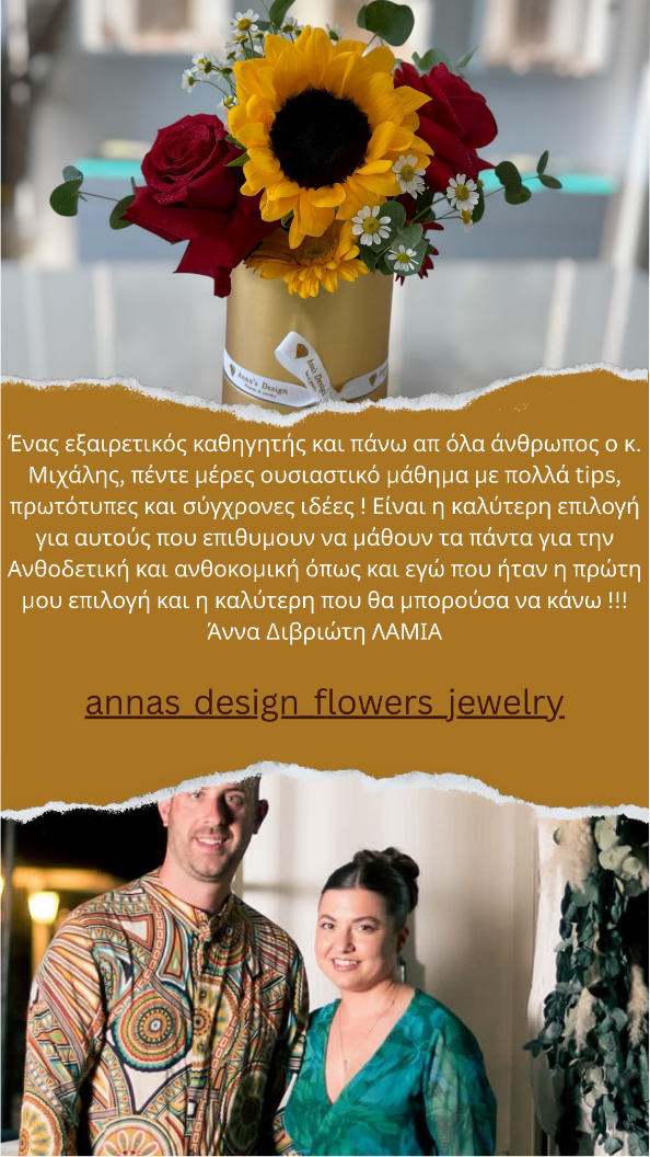 Ένας εξαιρετικός καθηγητής και πάνω απ όλα άνθρωπος ο κ. Μιχάλης, πέντε μέρες ουσιαστικό μάθημα με πολλά tips, πρωτότυπες και σύγχρονες ιδέες ! Είναι η καλύτερη επιλογή για αυτούς που επιθυμουν να μάθουν τα πάντα για την Ανθοδετική και ανθοκομική όπως και εγώ που ήταν η πρώτη μου επιλογή και η καλύτερη που θα μπορούσα να κάνω !!! Άννα Διβριώτη ΛΑΜΙΑ