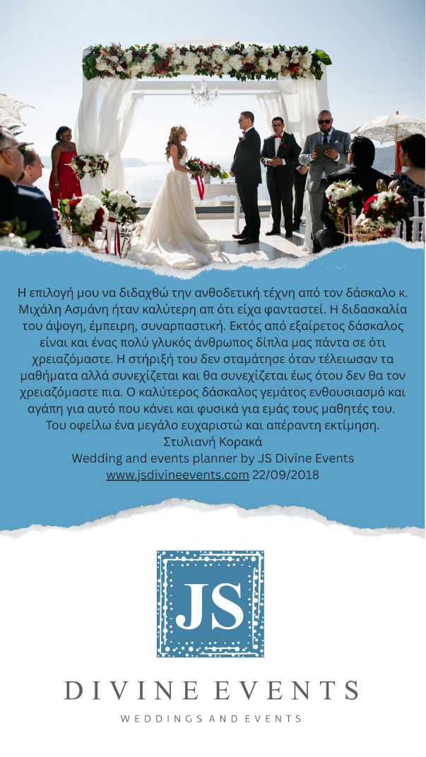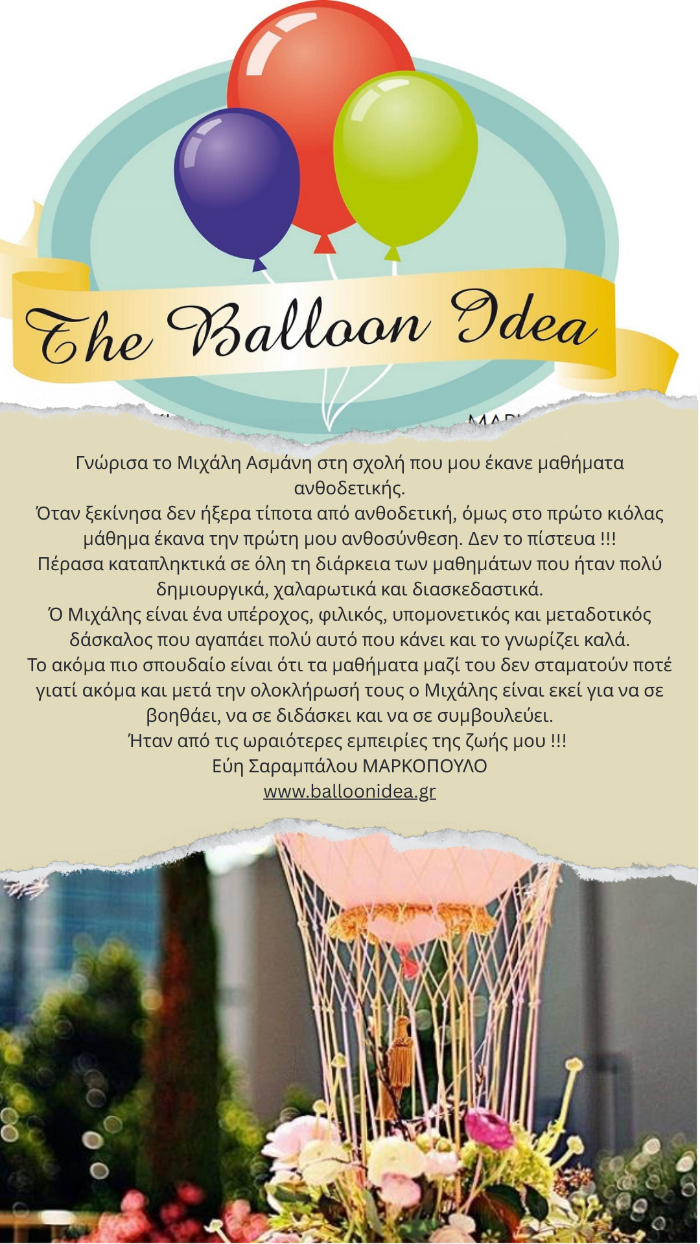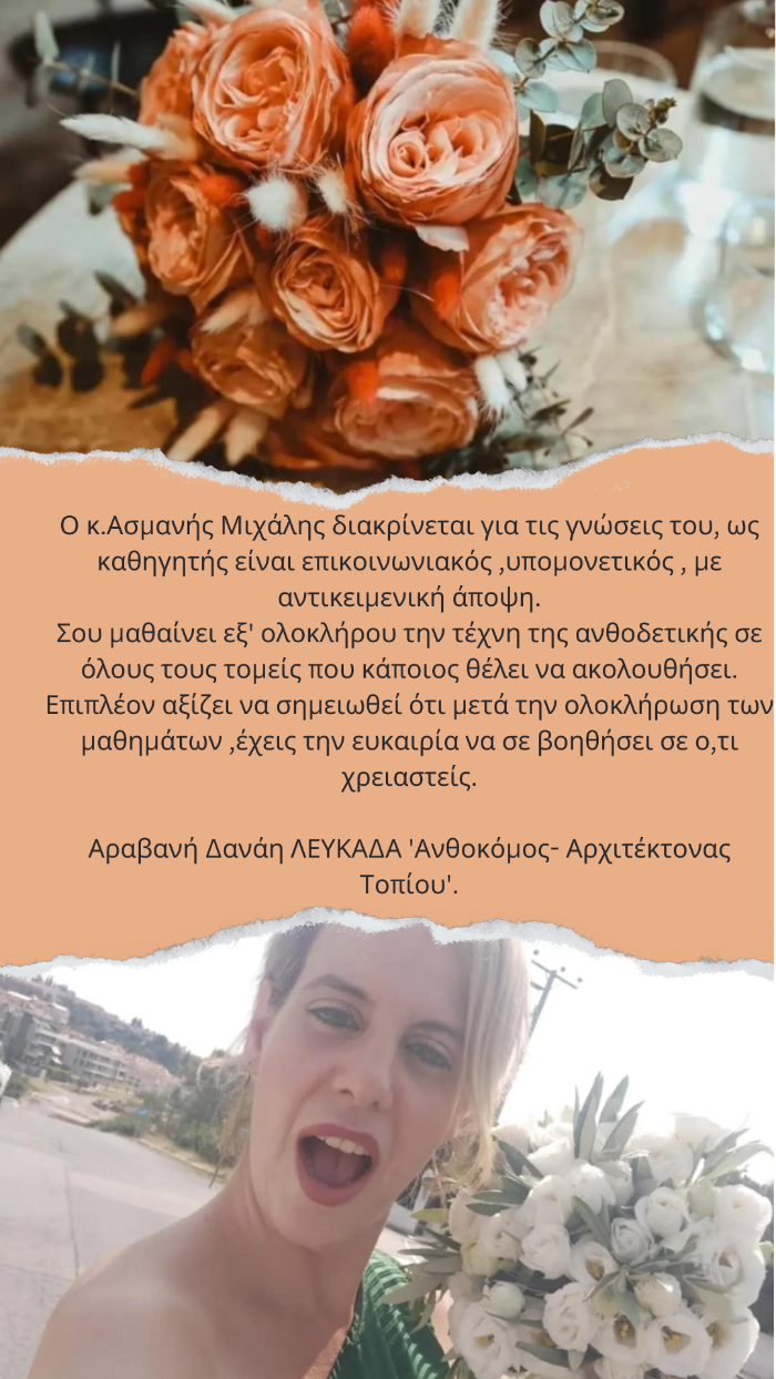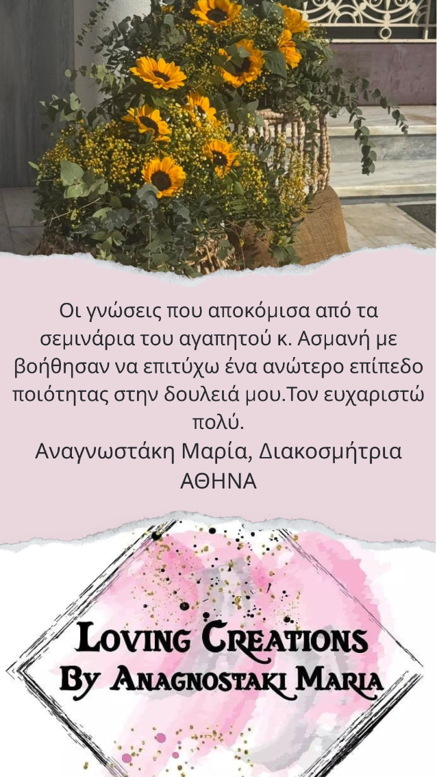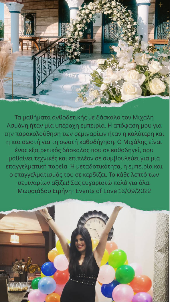 Τα μαθήματα ανθοδετικής με δάσκαλο τον Μιχάλη Ασμάνη ήταν μία υπέροχη εμπειρία. Η απόφαση μου για την παρακολούθηση των σεμιναρίων ήταν η καλύτερη και η πιο σωστή για τη σωστή καθοδήγηση. Ο Μιχάλης είναι ένας εξαιρετικός δάσκαλος που σε καθοδηγεί, σου μαθαίνει τεχνικές και επιπλέον σε συμβουλεύει για μια επαγγελματική πορεία. Η μεταδοτικότητα, η εμπειρία και ο επαγγελματισμός του σε κερδίζει. Το κάθε λεπτό των σεμιναρίων αξίζει! Σας ευχαριστώ πολύ για όλα. Μωυσιάδου Ειρήνη- Events of Love 13/09/2022
