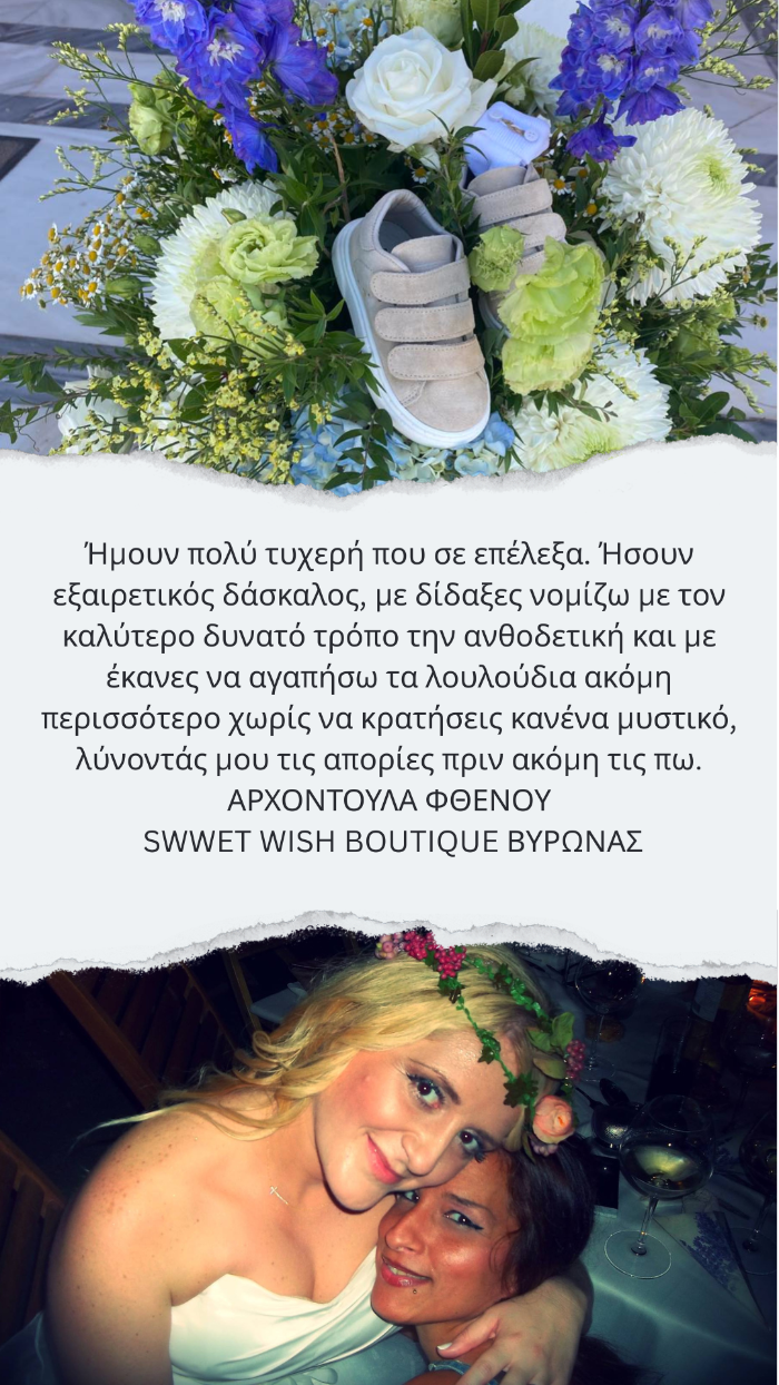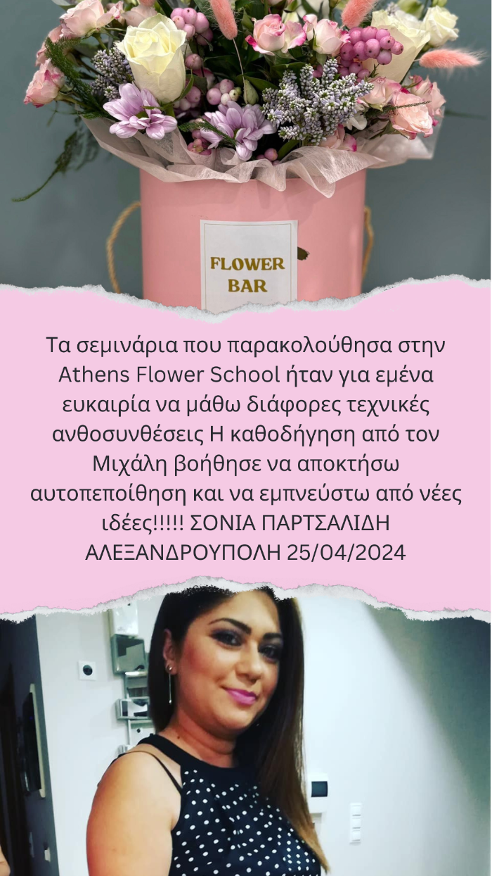 Το σεμινάριο του ATHENSFLOWERSCOOL ήταν πολύ ενδιαφέρον και, αποδείχθηκε, χρήσιμο στη δουλειά μου, με άριστο λόγο ποιότητας/τιμής.Σε σχετικά βραχύ χρονικό διάστημα, ο εισηγητής κος Μ. Ασμάνης, μου μετέφερε μεθοδικά, αλλά πρωτίστως άμεσα και απλά, γνώσεις και tricks από την εμφανώς ευρεία γνώση του στον τομέα της “ανθοδετικής” και όχι μόνον. Οι περιεκτικές ώρες θεωρίας ακολουθήθηκαν από πλούσιες εργαστηριακές, όπου είδα πώς η τέχνη της ανθοδετικής μπορεί να αναδείξει εκθετικά την ομορφιά του λουλουδιού. Θα χαρώ πολύ να συμμετάσχω και σε επόμενα σεμινάρια σας· και πάλι συγχαρητήρια και ένα μεγάλο ευχαριστώ! Παρασκευούλα Μπούκα VB class Event Planning ΙΩΑΝΝΙΝΑ 22/03/2023