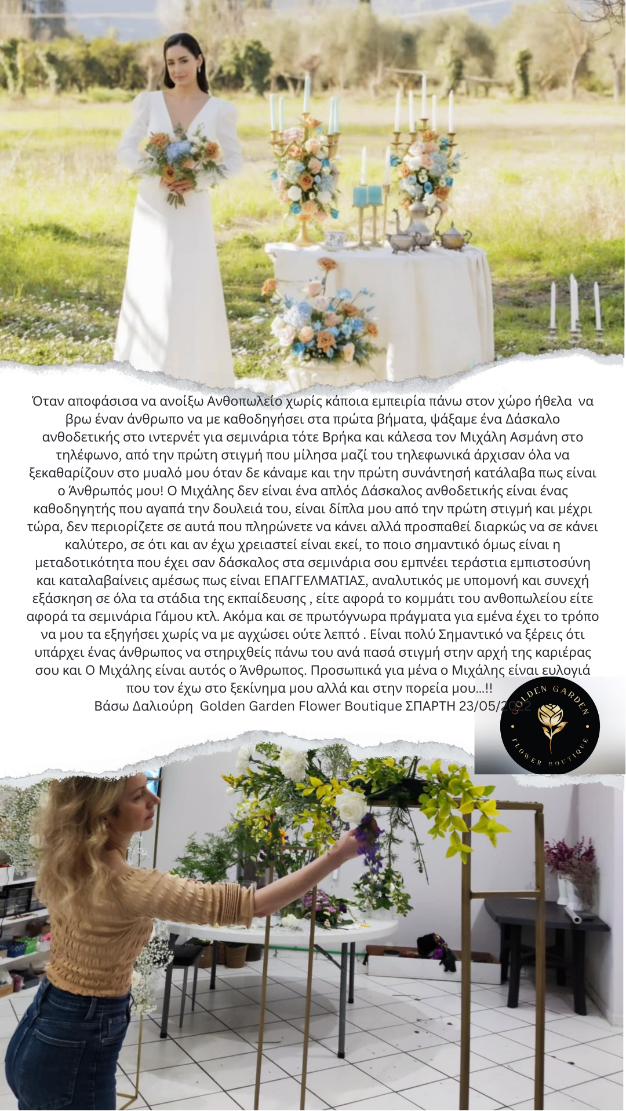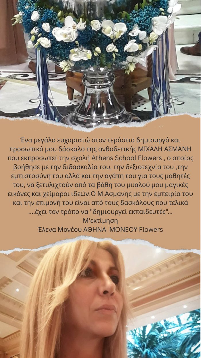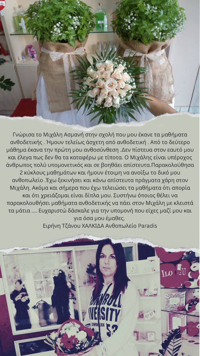 Όταν αποφάσισα να ανοίξω Ανθοπωλείο χωρίς κάποια εμπειρία πάνω στον χώρο ήθελα να βρω έναν άνθρωπο να με καθοδηγήσει στα πρώτα βήματα, ψάξαμε ένα Δάσκαλο ανθοδετικής στο ιντερνέτ για σεμινάρια τότε Βρήκα και κάλεσα τον Μιχάλη Ασμάνη στο τηλέφωνο, από την πρώτη στιγμή που μίλησα μαζί του τηλεφωνικά άρχισαν όλα να ξεκαθαρίζουν στο μυαλό μου όταν δε κάναμε και την πρώτη συνάντησή κατάλαβα πως είναι ο Άνθρωπός μου! Ο Μιχάλης δεν είναι ένα απλός Δάσκαλος ανθοδετικής είναι ένας καθοδηγητής που αγαπά την δουλειά του, είναι δίπλα μου από την πρώτη στιγμή και μέχρι τώρα, δεν περιορίζετε σε αυτά που πληρώνετε να κάνει αλλά προσπαθεί διαρκώς να σε κάνει καλύτερο, σε ότι και αν έχω χρειαστεί είναι εκεί, το ποιο σημαντικό όμως είναι η μεταδοτικότητα που έχει σαν δάσκαλος στα σεμινάρια σου εμπνέει τεράστια εμπιστοσύνη και καταλαβαίνεις αμέσως πως είναι ΕΠΑΓΓΕΛΜΑΤΙΑΣ, αναλυτικός με υπομονή και συνεχή εξάσκηση σε όλα τα στάδια της εκπαίδευσης , είτε αφορά το κομμάτι του ανθοπωλείου είτε αφορά τα σεμινάρια Γάμου κτλ. Ακόμα και σε πρωτόγνωρα πράγματα για εμένα έχει το τρόπο να μου τα εξηγήσει χωρίς να με αγχώσει ούτε λεπτό . Είναι πολύ Σημαντικό να ξέρεις ότι υπάρχει ένας άνθρωπος να στηριχθείς πάνω του ανά πασά στιγμή στην αρχή της καριέρας σου και O Μιχάλης είναι αυτός ο Άνθρωπος. Προσωπικά για μένα ο Μιχάλης είναι ευλογιά που τον έχω στο ξεκίνημα μου αλλά και στην πορεία μου…!!