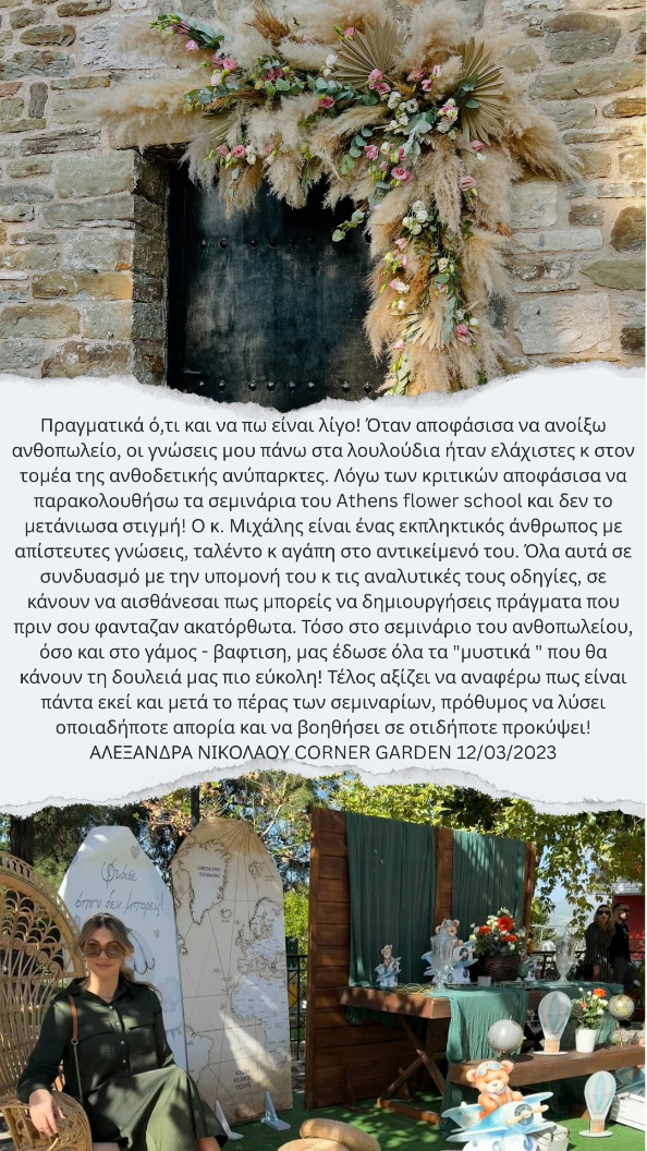 Πραγματικά ό,τι και να πω είναι λίγο! Όταν αποφάσισα να ανοίξω ανθοπωλείο, οι γνώσεις μου πάνω στα λουλούδια ήταν ελάχιστες κ στον τομέα της ανθοδετικής ανύπαρκτες. Λόγω των κριτικών αποφάσισα να παρακολουθήσω τα σεμινάρια του Athens flower school και δεν το μετάνιωσα στιγμή! Ο κ. Μιχάλης είναι ένας εκπληκτικός άνθρωπος με απίστευτες γνώσεις, ταλέντο κ αγάπη στο αντικείμενό του. Όλα αυτά σε συνδυασμό με την υπομονή του κ τις αναλυτικές τους οδηγίες, σε κάνουν να αισθάνεσαι πως μπορείς να δημιουργήσεις πράγματα που πριν σου φανταζαν ακατόρθωτα. Τόσο στο σεμινάριο του ανθοπωλείου, όσο και στο γάμος - βαφτιση, μας έδωσε όλα τα "μυστικά " που θα κάνουν τη δουλειά μας πιο εύκολη! Τέλος αξίζει να αναφέρω πως είναι πάντα εκεί και μετά το πέρας των σεμιναρίων, πρόθυμος να λύσει οποιαδήποτε απορία και να βοηθήσει σε οτιδήποτε προκύψει! ΑΛΕΞΑΝΔΡΑ ΝΙΚΟΛΑΟΥ CORNER GARDEN 12/03/2023