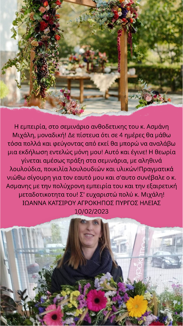 Η εμπειρία, στο σεμινάριο ανθοδετικης του κ. Ασμάνη Μιχάλη, μοναδική! Δε πίστευα ότι σε 4 ημέρες θα μάθω τόσα πολλά και φεύγοντας από εκεί θα μπορώ να αναλάβω μια εκδήλωση εντελώς μόνη μου! Αυτό και έγινε! Η θεωρία γίνεται αμέσως πράξη στα σεμινάρια, με αληθινά λουλούδια, ποικιλία λουλουδιών και υλικών!Πραγματικά νιώθω σίγουρη για τον εαυτό μου και σ'αυτο συνέβαλε ο κ. Ασμανης με την πολύχρονη εμπειρία του και την εξαιρετική μεταδοτικοτητα του! Σ' ευχαριστώ πολύ κ. Μιχάλη! ΙΩΑΝΝΑ ΚΑΤΣΙΡΟΥ ΑΓΡΟΚΗΠΟΣ ΠΥΡΓΟΣ ΗΛΕΙΑΣ 10/02/2023