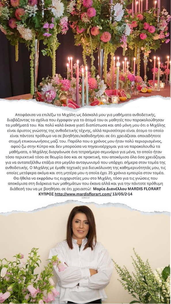 Mε το Μιχάλη είχα τη χαρά να παρακολουθήσω και τους 2 κύκλους μαθημάτων. Ηταν μία πολύ ιδιάιτερη εμπειρία για μένα, πολυ δημιουργική και ενδιαφέρουσα. Η εμπειρία του, η καθοδήγηση, οι ιδέες και η αγάπη του για τα λουλούδια μου άνοιξαν νέους ορίζοντες σε αυτό τον επαγγελματικό τομέα.