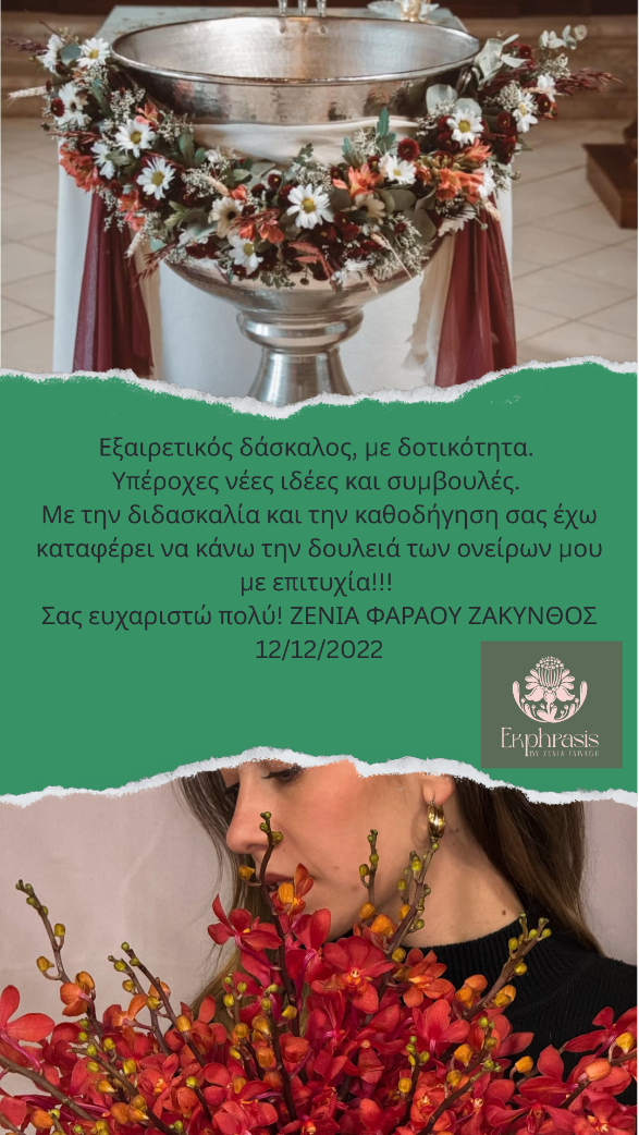 Το σεμινάριο του ATHENSFLOWERSCOOL ήταν πολύ ενδιαφέρον και, αποδείχθηκε, χρήσιμο στη δουλειά μου, με άριστο λόγο ποιότητας/τιμής.Σε σχετικά βραχύ χρονικό διάστημα, ο εισηγητής κος Μ. Ασμάνης, μου μετέφερε μεθοδικά, αλλά πρωτίστως άμεσα και απλά, γνώσεις και tricks από την εμφανώς ευρεία γνώση του στον τομέα της “ανθοδετικής” και όχι μόνον. Οι περιεκτικές ώρες θεωρίας ακολουθήθηκαν από πλούσιες εργαστηριακές, όπου είδα πώς η τέχνη της ανθοδετικής μπορεί να αναδείξει εκθετικά την ομορφιά του λουλουδιού. Θα χαρώ πολύ να συμμετάσχω και σε επόμενα σεμινάρια σας· και πάλι συγχαρητήρια και ένα μεγάλο ευχαριστώ! Παρασκευούλα Μπούκα VB class Event Planning ΙΩΑΝΝΙΝΑ 22/03/2023